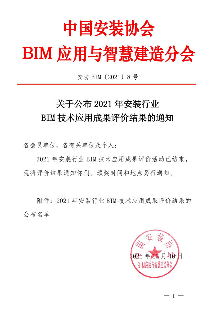 公司BIM成果榮獲安裝行業(yè)BIM技術(shù)應(yīng)用成果“國內(nèi)領(lǐng)先(I類)”評(píng)價(jià)